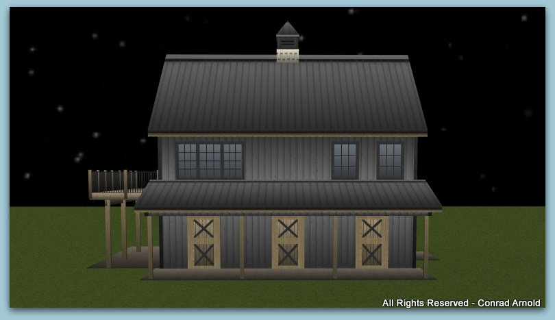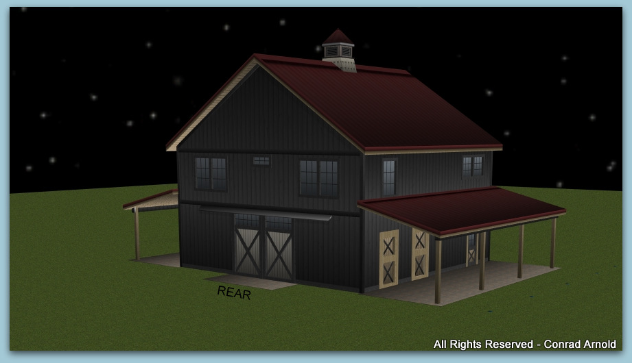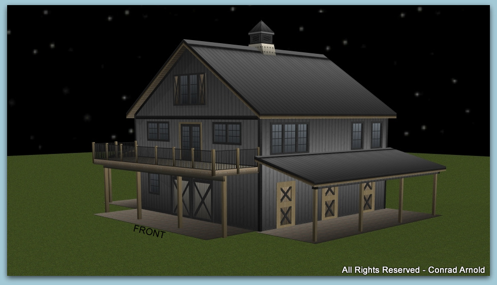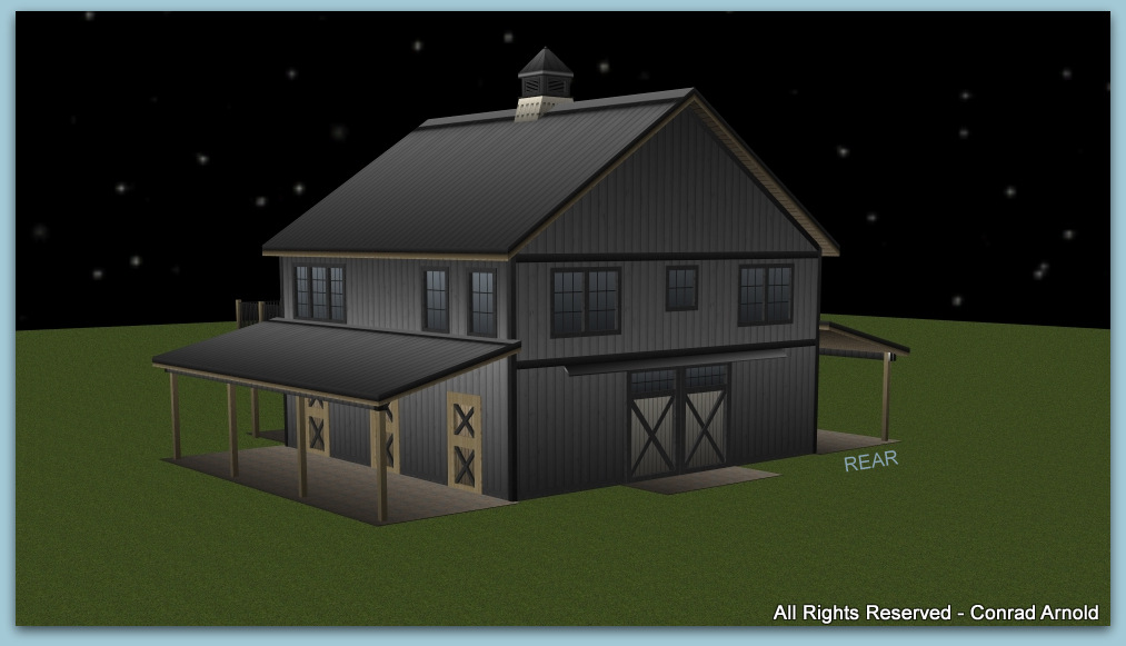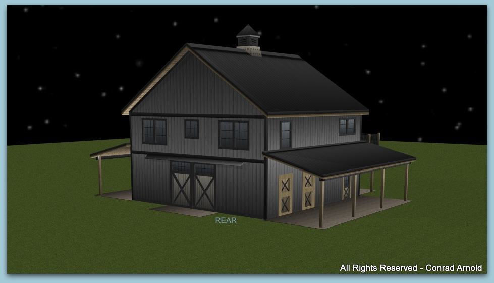 Detailed Footing, Detailed Post & Footing Layout, Detailed Floor Plan, Front Elevation, Rear Elevation, Left Elevation, Right Elevation. Elevations detail the outside dimensions and exterior finish materials.