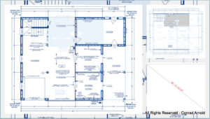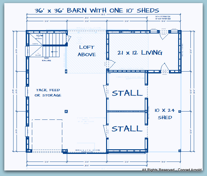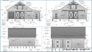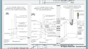 Detailed Footing, Detailed Post & Footing Layout, Detailed Floor Plan, Front Elevation, Rear Elevation, Left Elevation, Right Elevation. Elevations detail the outside dimensions and exterior finish materials.
