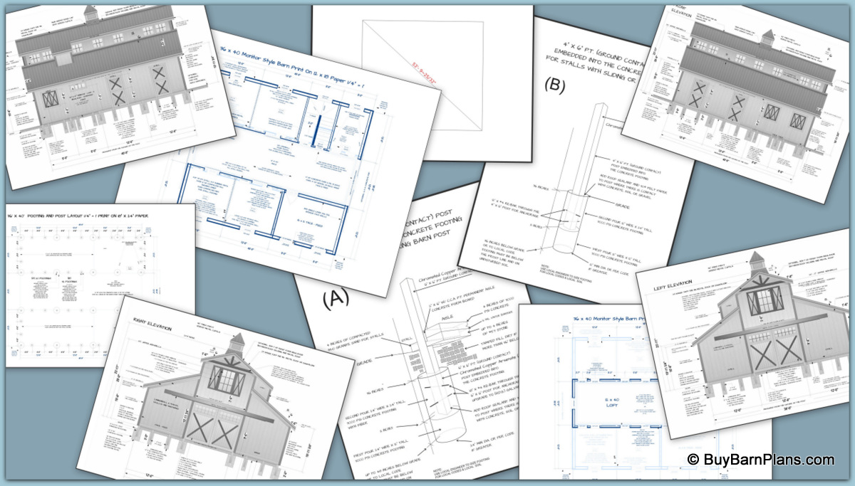 Detailed Footing, Detailed Post & Footing Layout, Detailed Floor Plan, Front Elevation, Rear Elevation, Left Elevation, Right Elevation. Elevations detail the outside dimensions and exterior finish materials.