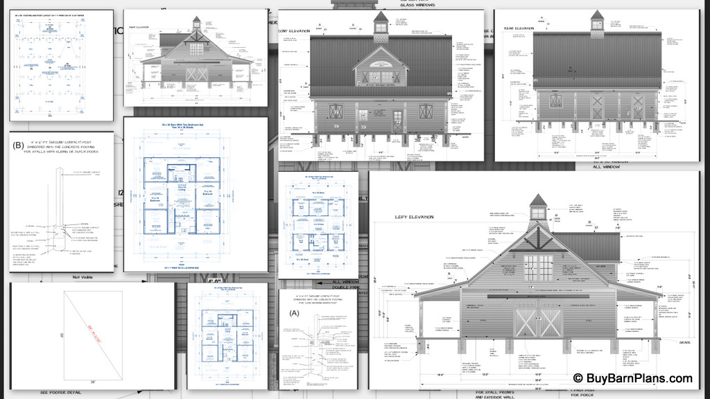Detailed Footing, Detailed Post & Footing Layout, Detailed Floor Plan, Front Elevation, Rear Elevation, Left Elevation, Right Elevation. Elevations detail the outside dimensions and exterior finish materials.