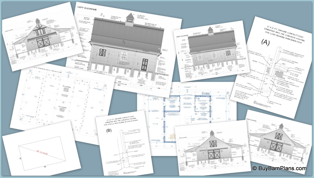 Detailed Footing, Detailed Post & Footing Layout, Detailed Floor Plan, Front Elevation, Rear Elevation, Left Elevation, Right Elevation. Elevations detail the outside dimensions and exterior finish materials.