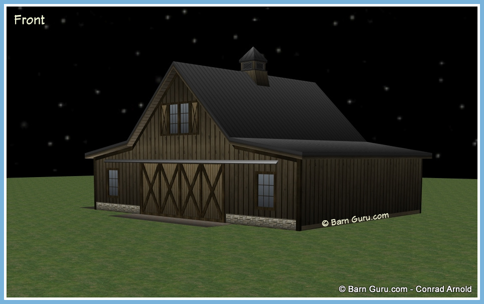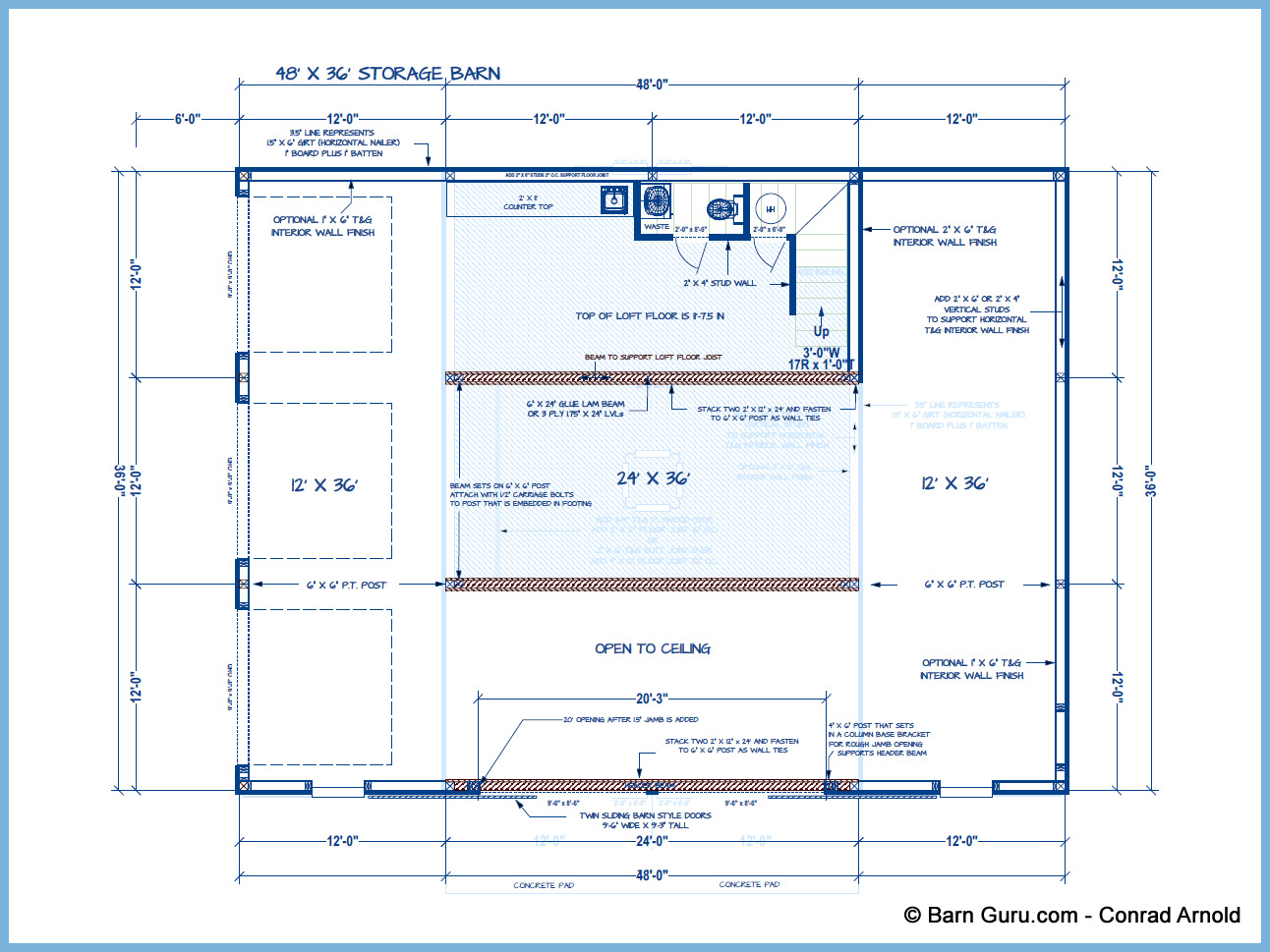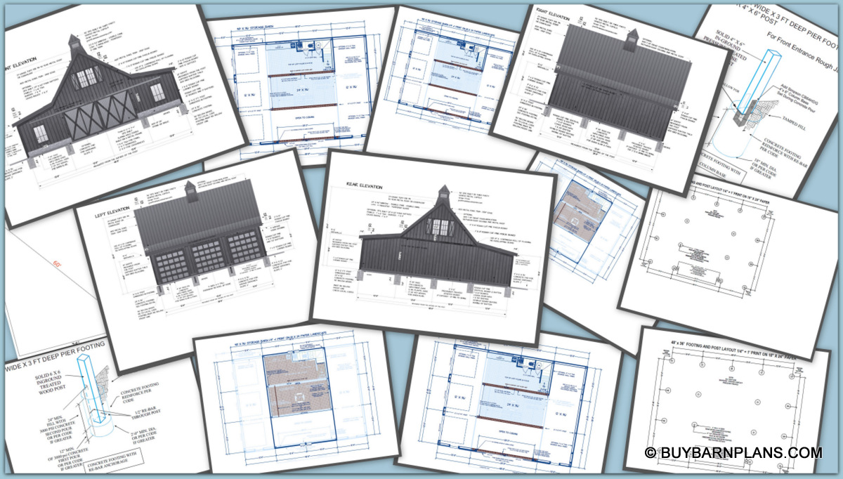 Detailed Footing, Detailed Post & Footing Layout, Detailed Floor Plan, Front Elevation, Rear Elevation, Left Elevation, Right Elevation. Elevations detail the outside dimensions and exterior finish materials.
