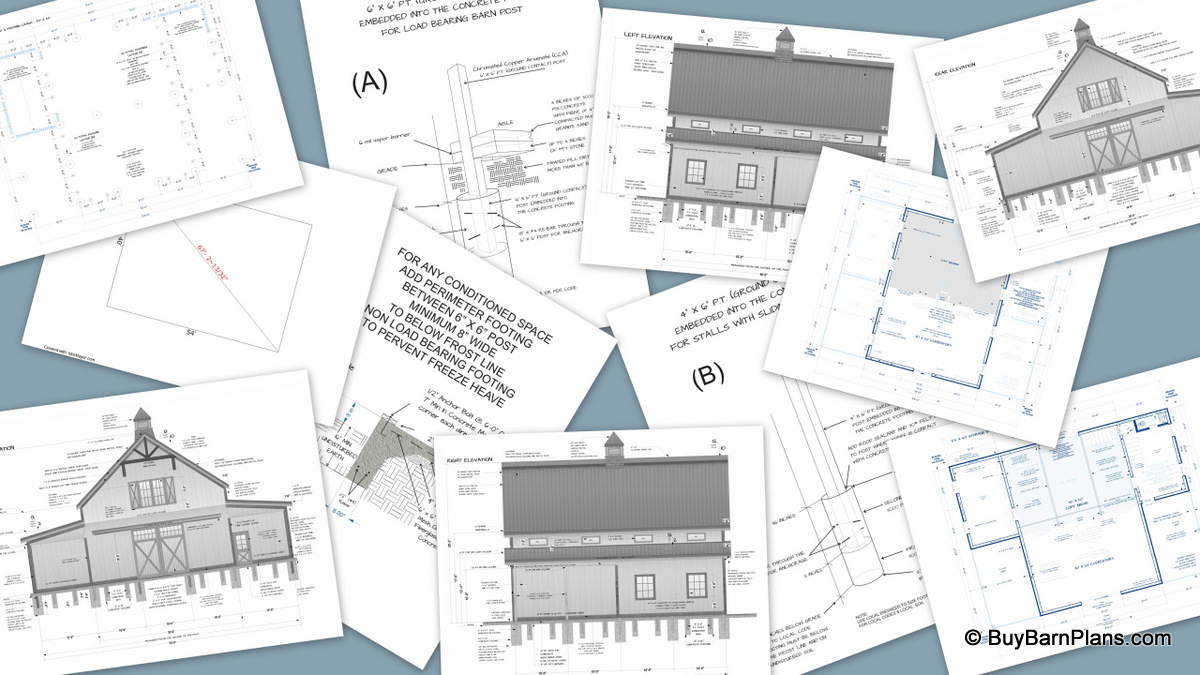 Detailed Footing, Detailed Post & Footing Layout, Detailed Floor Plan, Front Elevation, Rear Elevation, Left Elevation, Right Elevation. Elevations detail the outside dimensions and exterior finish materials.