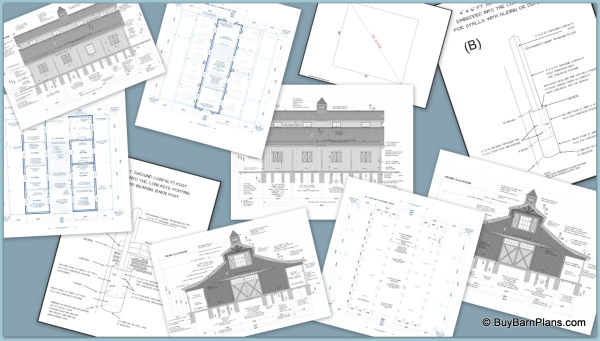 Detailed Footing, Detailed Post & Footing Layout, Detailed Floor Plan, Front Elevation, Rear Elevation, Left Elevation, Right Elevation. Elevations detail the outside dimensions and exterior finish materials.
