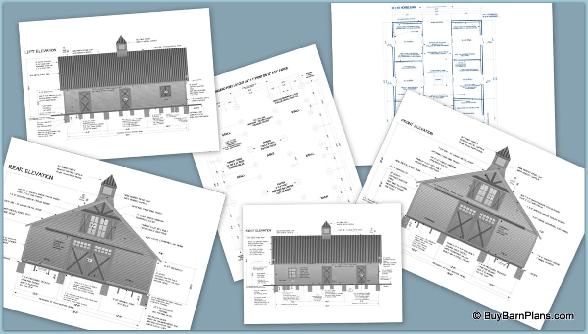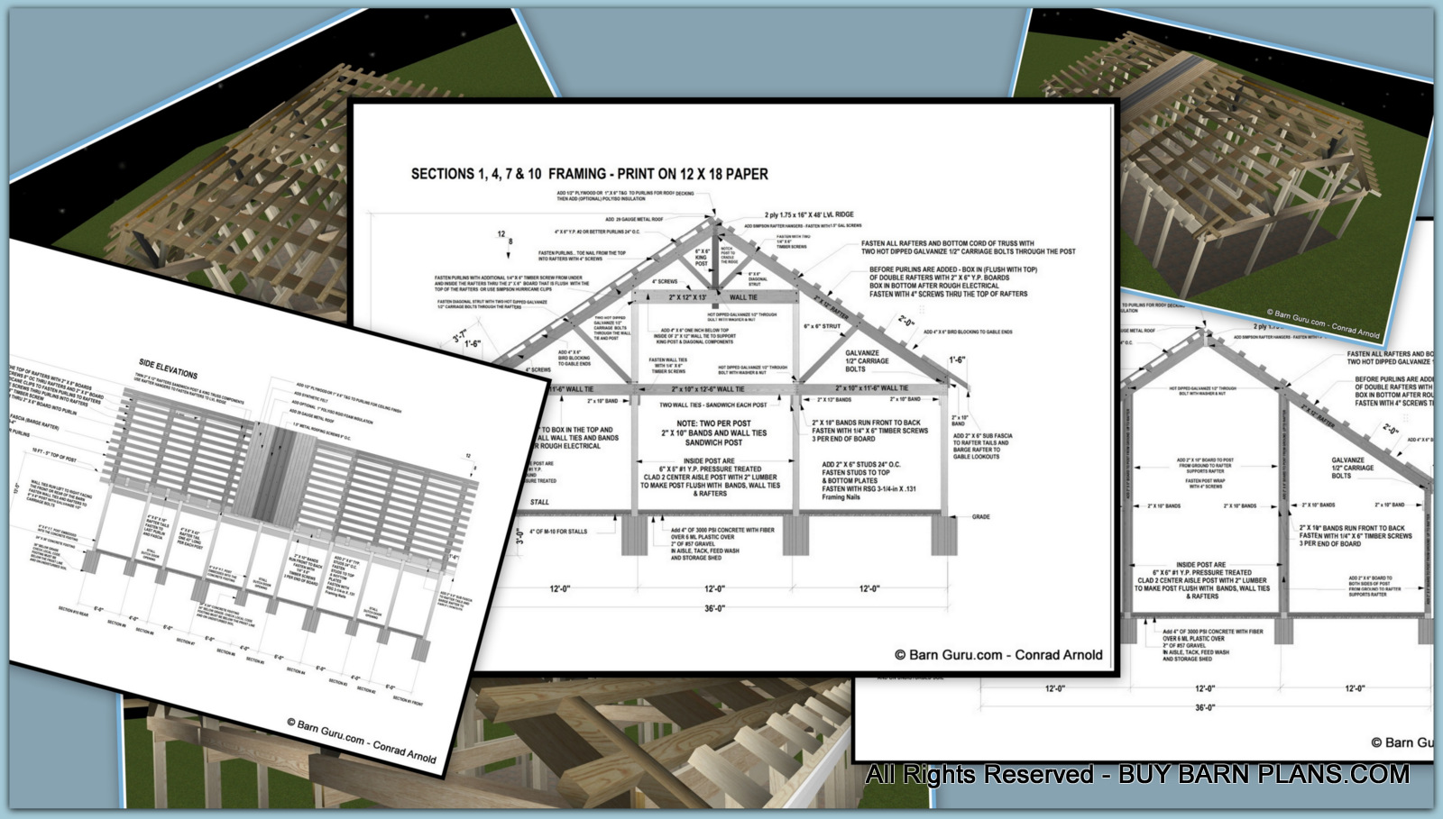 Detailed Footing, Detailed Post & Footing Layout, Detailed Floor Plan, Front Elevation, Rear Elevation, Left Elevation, Right Elevation. Elevations detail the outside dimensions and exterior finish materials.