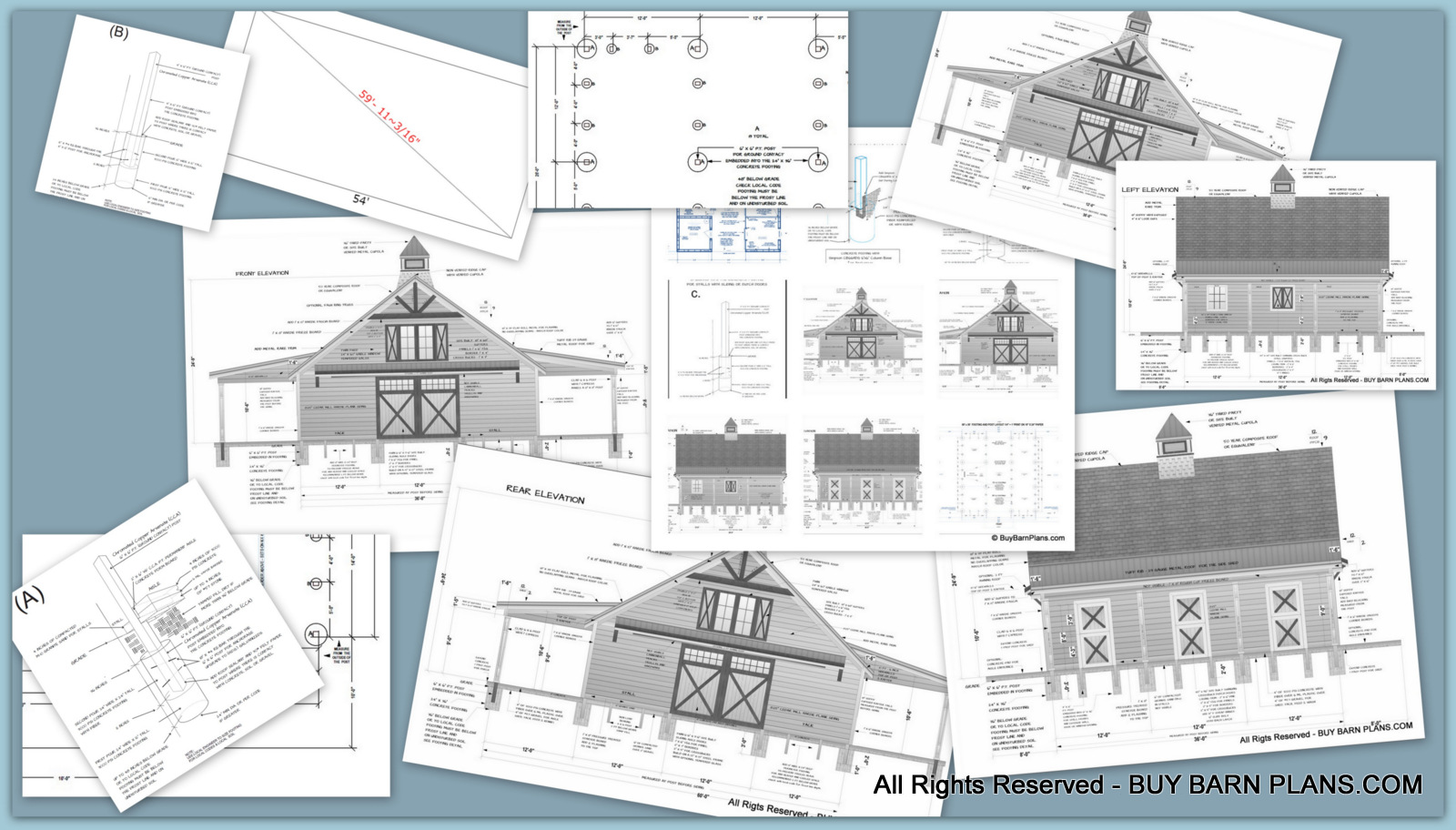 Detailed Footing, Detailed Post & Footing Layout, Detailed Floor Plan, Front Elevation, Rear Elevation, Left Elevation, Right Elevation. Elevations detail the outside dimensions and exterior finish materials.